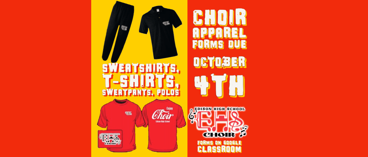 Choir apparel orders are due on Monday, October 4th. Please make sure to fill out this google form and that you have followed instructions on how to pay.